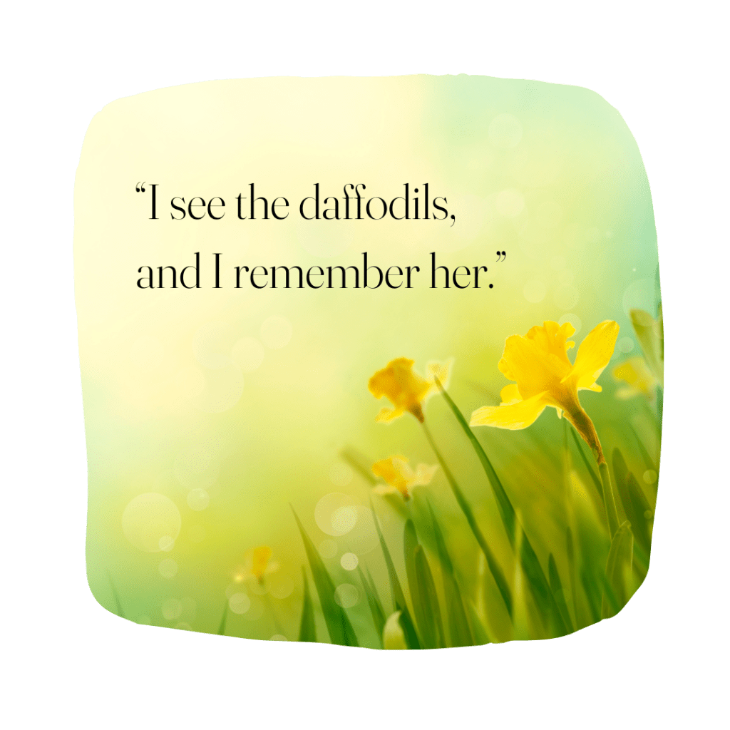 I plant my daffodils each year, and when they bloom, I remember her. It’s a way of remembering, but also honouring her. My love of plants and gardening comes from her, I’m sure.