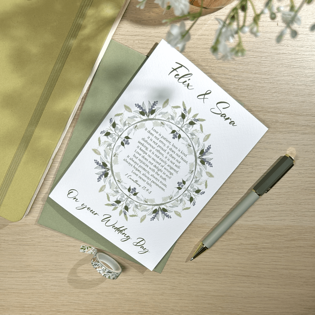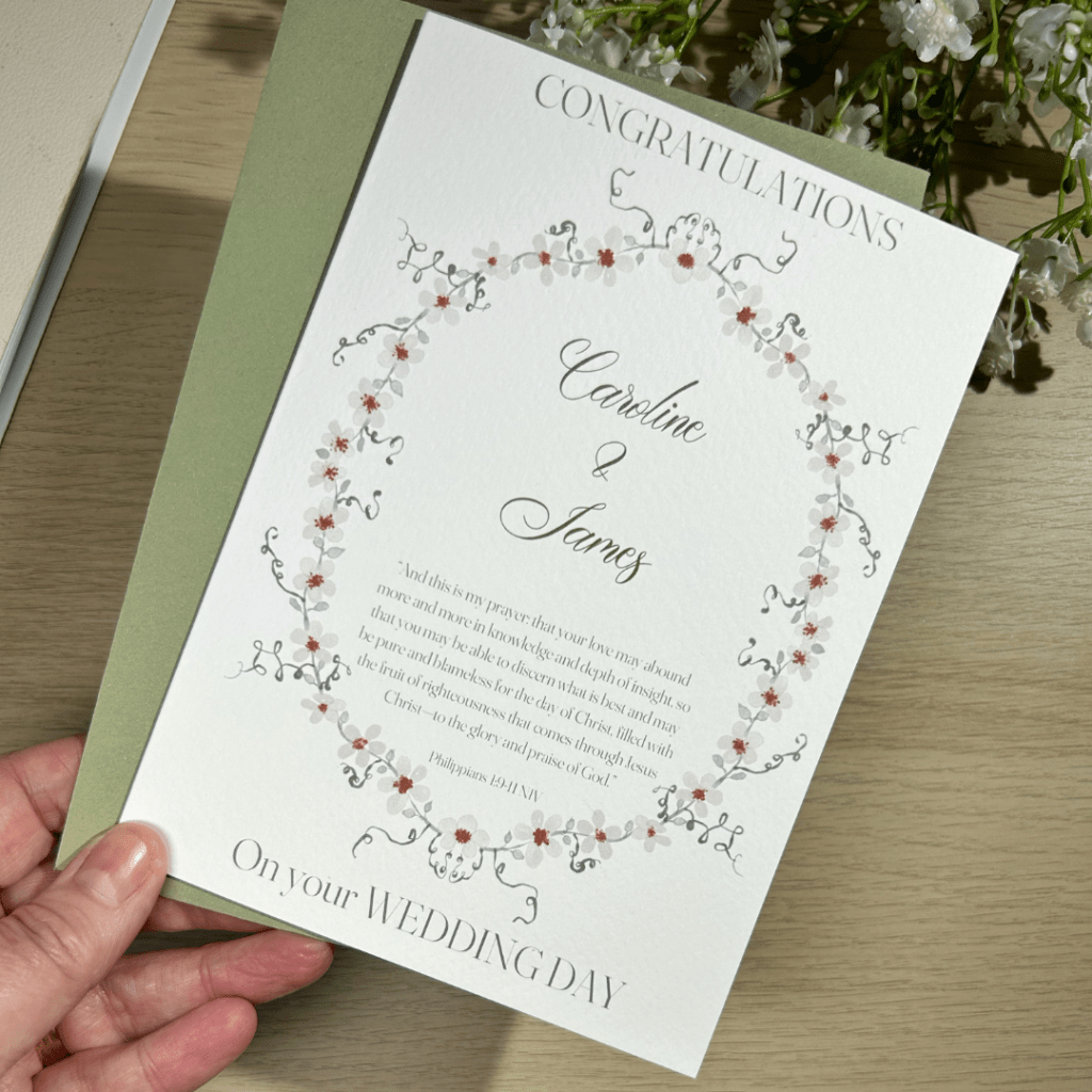 Celebrate the newlyweds’ special day with a beautiful Christian card. With a stunning design featuring a border of delicate flowers and leaves, and the addition of the couple’s names, this card is a wonderful keepsake that will be treasured for years to come.