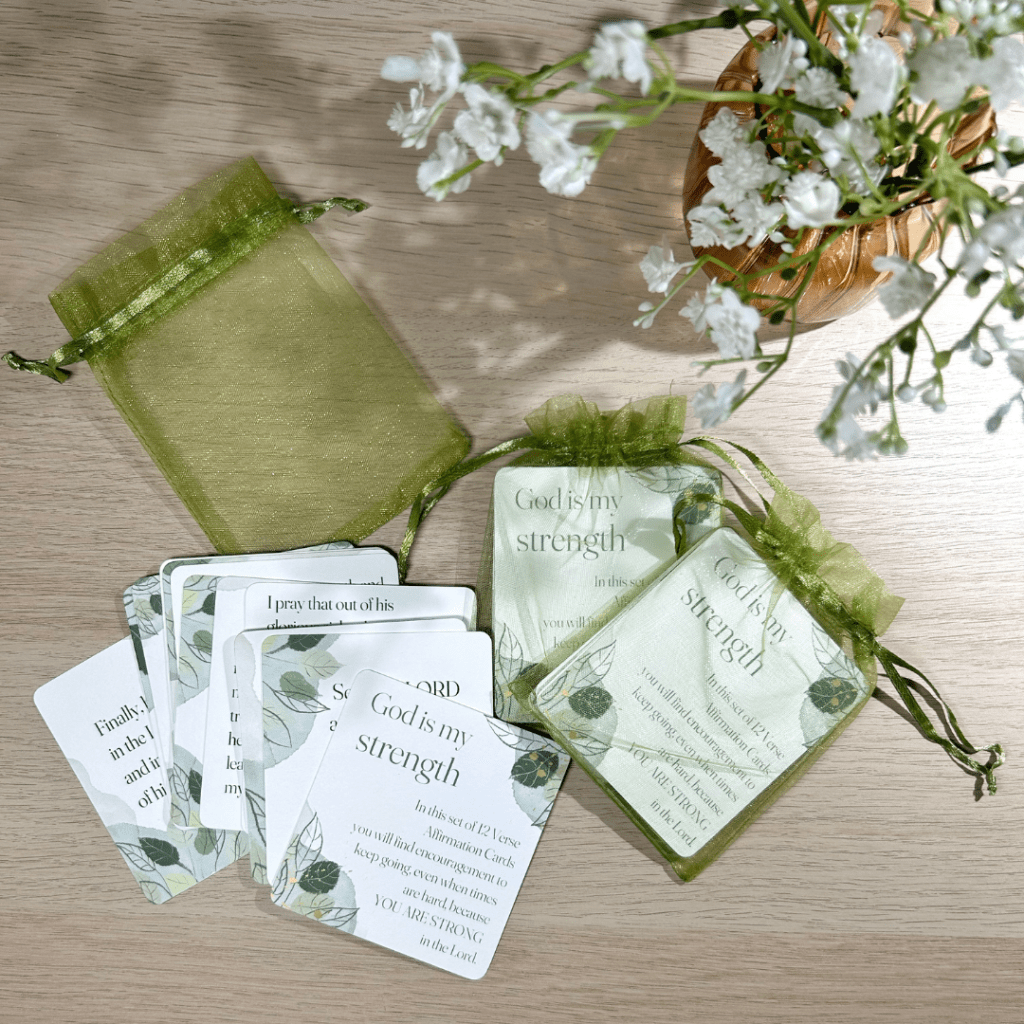God is my Strength Mini Bible Verse Affirmation Cards – A thoughtful Gift for Any Occasion. The set of 12 Bible verse cards is designed with a green leafy illustration. Each card includes a Bible Verse on the theme of ‘strength’ to encourage you. Available from £8.90