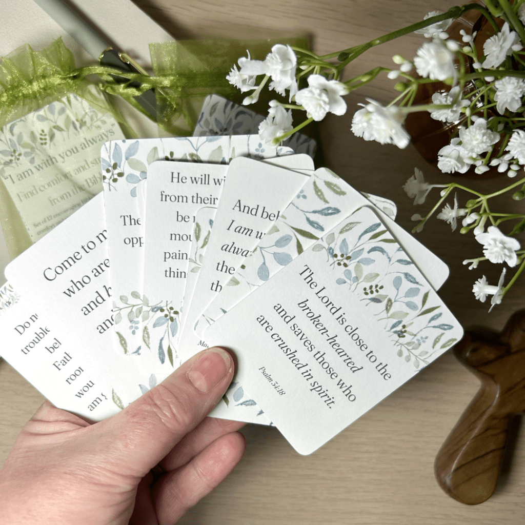Find comfort and strength during difficult times with this set of 12 pocket sized Bible Verse Affirmation cards. Option to add on coordinated Greetings Card.