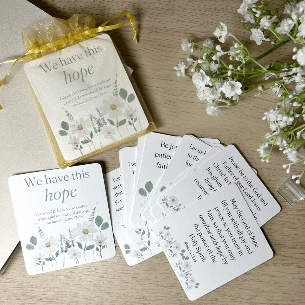 The set of 12 Bible verse cards are designed with a floral meadow illustration. Each card includes a Bible Verse on the theme of ‘Hope ‘ to remind you of the hope that we have in Jesus Christ.
