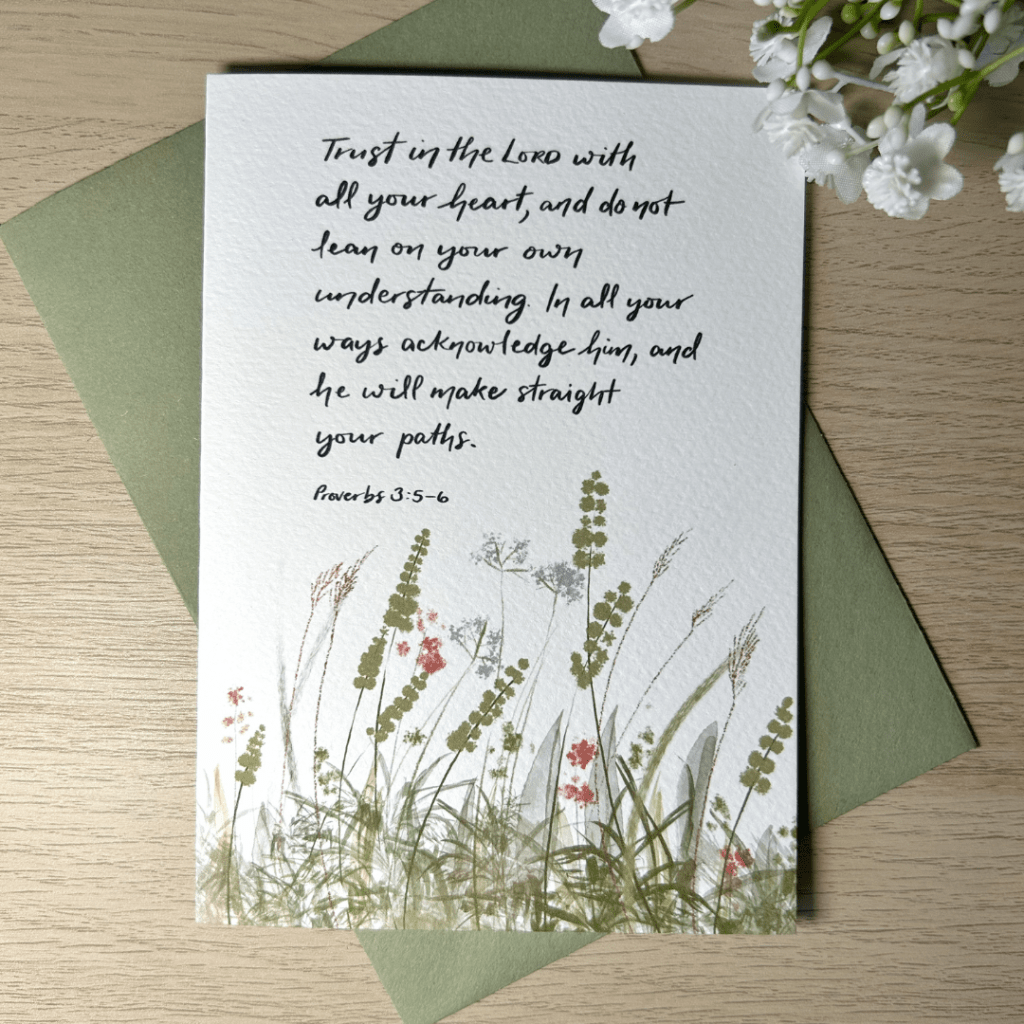 Featuring an illustration of a grassy meadow, this card includes a well known and encouraging Bible Verse from Proverbs 3:5-6, which I have handwritten, and says: